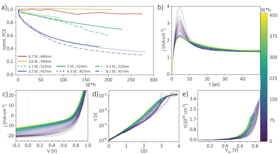 埃爾朗根-紐倫堡大學(xué)Thomas Heumüller教授提出了一種有機(jī)太陽能電池(OSC)穩(wěn)定性測試方法,旨在為OSC退化模式的原因提供更獨(dú)特的見解。該方法涉及使用高輻射劑量的單色光來加速老化的降解機(jī)制,同時(shí)通過一系列原位穩(wěn)態(tài)和瞬態(tài)電測量來監(jiān)測設(shè)備。實(shí)驗(yàn)結(jié)果伴隨著漂移擴(kuò)散模擬,以定位降解路徑。對PM6:Y6基OSC進(jìn)行了測試,實(shí)驗(yàn)揭示了導(dǎo)致PM6:Y6層內(nèi)陷阱態(tài)密度增加的降解機(jī)制。瞬態(tài)模擬表明,這些態(tài)是在PM6:Y6和電子傳輸層之間的界面處或周圍形成的。此外,還證明了照明波長對降解模式的驚人主導(dǎo)影響。相關(guān)成果以“Revealing Photodegradation Pathways of Organic Solar Cells by Spectrally Resolved Accelerated Lifetime Analysis”發(fā)表在Advanced Energy Materials上。