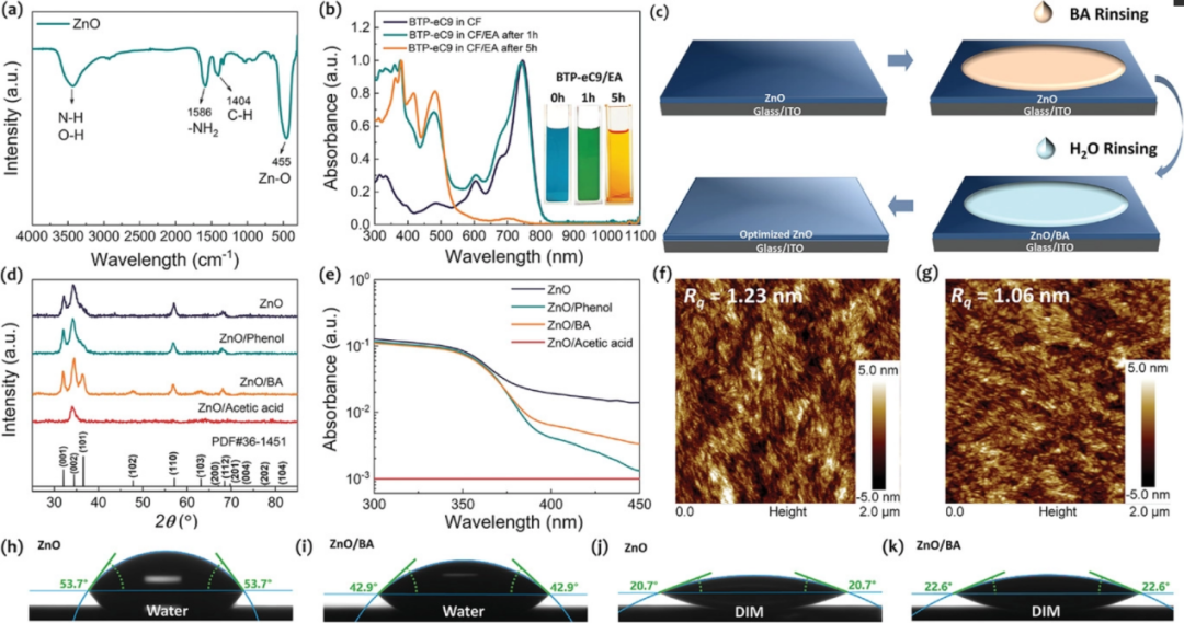 中科院化學(xué)所侯劍輝研究員和北京科技大學(xué)鄭眾教授等人報(bào)道了一種簡單、有效、經(jīng)濟(jì)的方法,用硼酸(BA)去除溶膠-凝膠ZnO CIL中殘留的胺而不損傷ZnO。BA被用作胺清洗劑,因?yàn)槠渚哂泻线m的酸離解常數(shù)(pKa)以避免ZnO分解。X射線光電子能譜(XPS)結(jié)果表明,由于BA的沖洗,殘留的胺可以被有效地去除。ZnO的功函數(shù)(Φ)可以從3.86 eV改變到3.79 eV,導(dǎo)致基于PBDB-TF:HDO-4Cl:BTP-eC9的OSCs的Voc增加10 meV。此外,清洗后的ZnO CIL在電子提取能力方面表現(xiàn)出明顯的改善,例如BA處理的ZnO中的電子提取可以在44.29 ns內(nèi)完成(比原始ZnO快33.64%)。另一方面,ZnO CIL的電荷收集能力增強(qiáng),ZnO CIL的功函數(shù)有利于實(shí)現(xiàn)更高的Voc。ZnO CIL的改進(jìn)性質(zhì)將PBDB-TF:HDO-4Cl:BTP-eC9 OSC的FF從75.07%提高到78.13%,并且將PBDB-TF: BTP-eC9 OSC的FF從73.97%提高到77.28%?;谏鲜鼋Y(jié)果,優(yōu)化的單結(jié)OSCs的穩(wěn)定性和功率轉(zhuǎn)換效率(PCE)同時(shí)提高?;钚悦娣e為0.04和1.00 cm2的電池分別表現(xiàn)出18.40%和17.42%的PCEs。此外,基于BA處理的ZnO CIL的串聯(lián)OSCs表現(xiàn)出19.56%的PCE,證明了所提出方法的有效性。