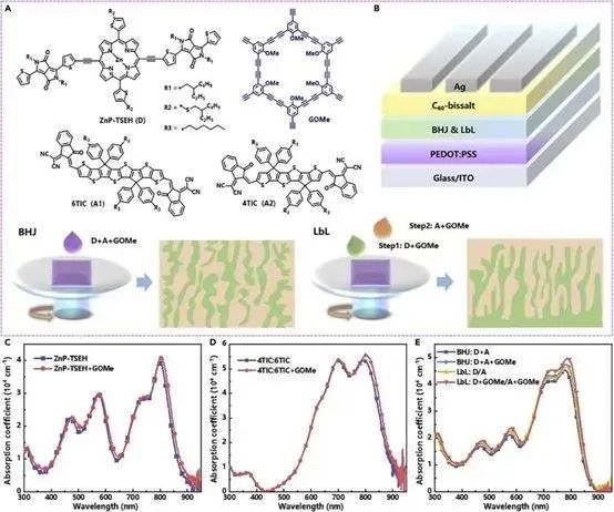 山東大學(xué)物質(zhì)創(chuàng)制與能量轉(zhuǎn)換科學(xué)研究中心高珂教授、李玉良院士、華南師范大學(xué)先進(jìn)光電子研究院輦理教授等人聯(lián)合報(bào)道了一種高效的ASM OSC。研究人員通過結(jié)合LbL沉積和固體添加劑甲氧基取代石墨炔(GOMe)處理來合理控制順序形態(tài)演變和垂直成分分布,最終獲得了一種高效的ASM OSCs。與BHJ共混物相比,LbL處理的共混物具有底部給體富集、頂部受體富集的最佳垂直分層。此外,結(jié)果表明,將固體添加劑GOMe添加到給體層略微增強(qiáng)了分子堆積并增加了表面粗糙度,從而為隨后的受體沉積提供了合適的基質(zhì),這顯著促進(jìn)了受體擴(kuò)散從而形成優(yōu)選的垂直分布。另一個(gè)方面,GOMe處理的受體層顯示出更緊密的分子堆積。通過這種方法,合理控制的共混物形態(tài)同時(shí)具有緊湊的分子堆積、足夠的D/A界面和垂直傳輸通道,從而實(shí)現(xiàn)了增強(qiáng)的激子解離和電荷傳輸。最終,基于ZnP-TSEH:4TIC:6TIC的器件獲得了77.31%的FF,以及17.18%的突破效率(驗(yàn)證效率:17.08%),顯著高于對照器件。